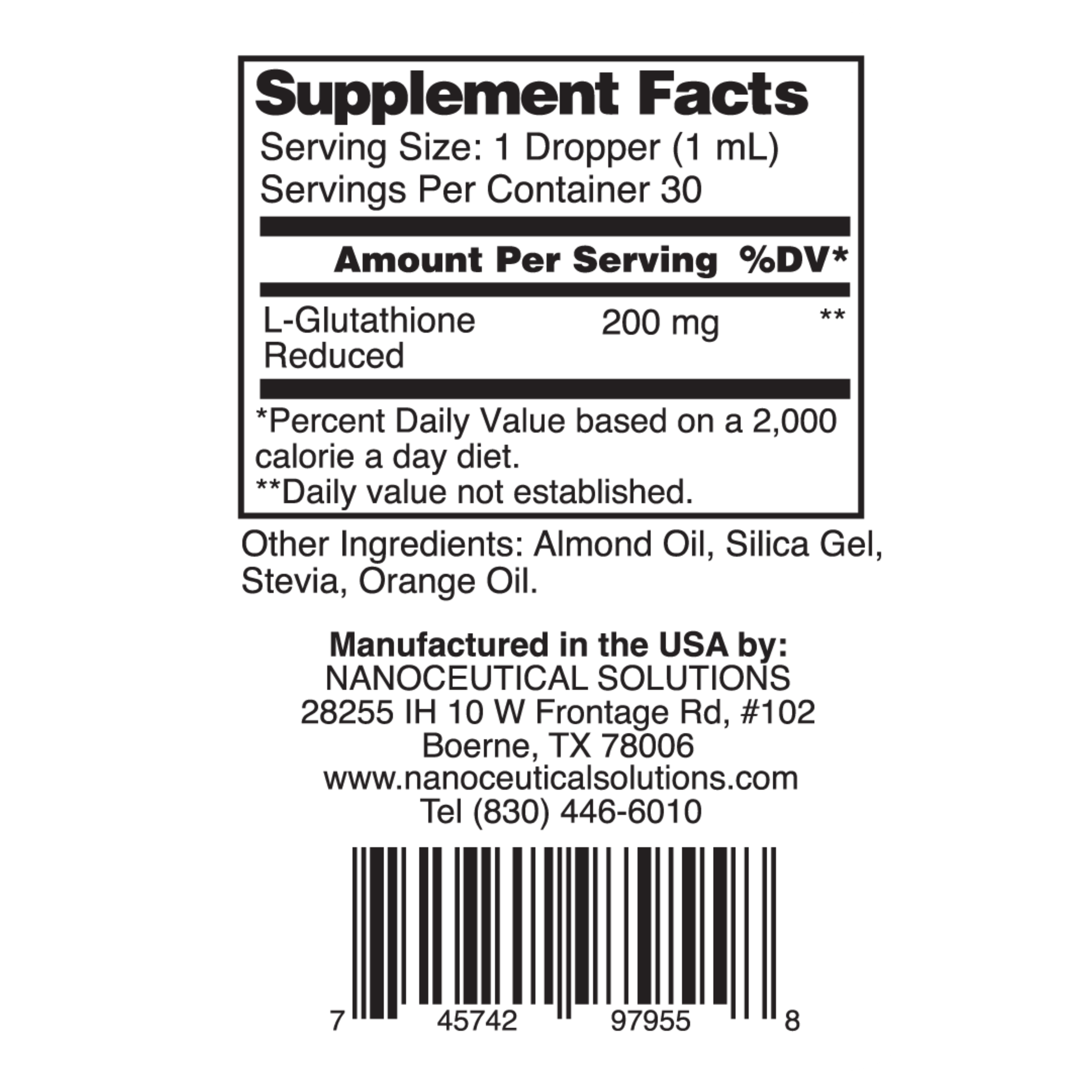 Shake the bottle well and squeeze the rubber dropper bulb to draw up 1 ml of product. Place 1ml of product in mouth and hold for 30 to 90 seconds, then swallow. Each 1 ml daily dosage of Nano Glutathione delivers 200 mg of L‑Glutathione Reduced.