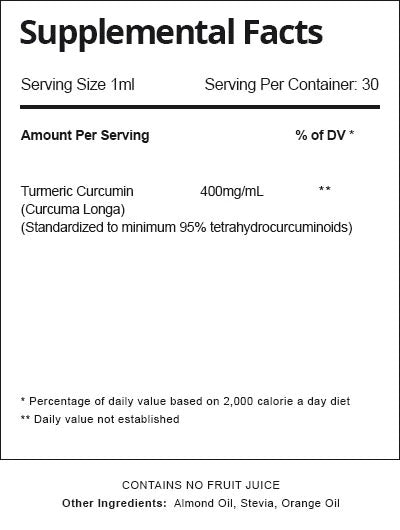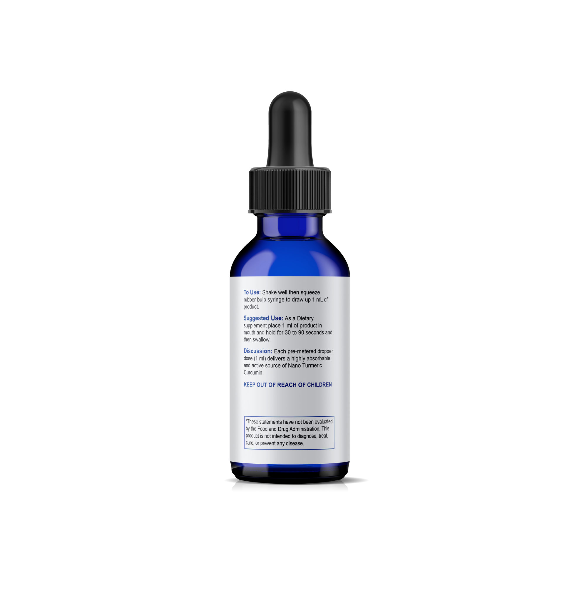 Shake the bottle well and squeeze the rubber dropper bulb to draw up 1 ml of product. Place 1ml of product in mouth and hold for 90 seconds and then swallow. Each 1 ml daily dosage of Nano Turmeric Curcumin delivers 400mg/mL of Turmeric Curcumin, standardized to minimum 95% tetrahydrocurcuminoids.
